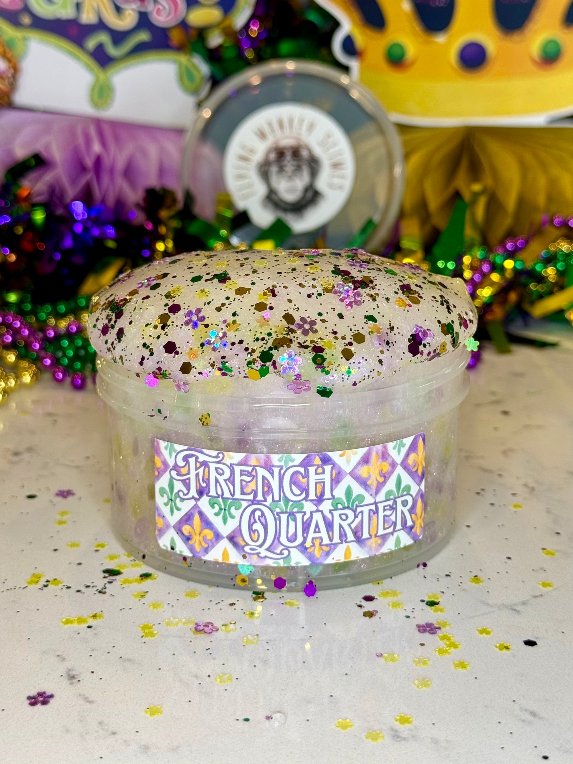 French Quater is a crunchy silica rock slime inspired by the charm, color, and character of New Orleans’ most iconic neighborhood. Coated in a shimmering violet glaze with dazzling yellow, purple, and green glitter. This slime catches the light beautifully, just like the iron balconies and pastel homes lining the French Quarter.