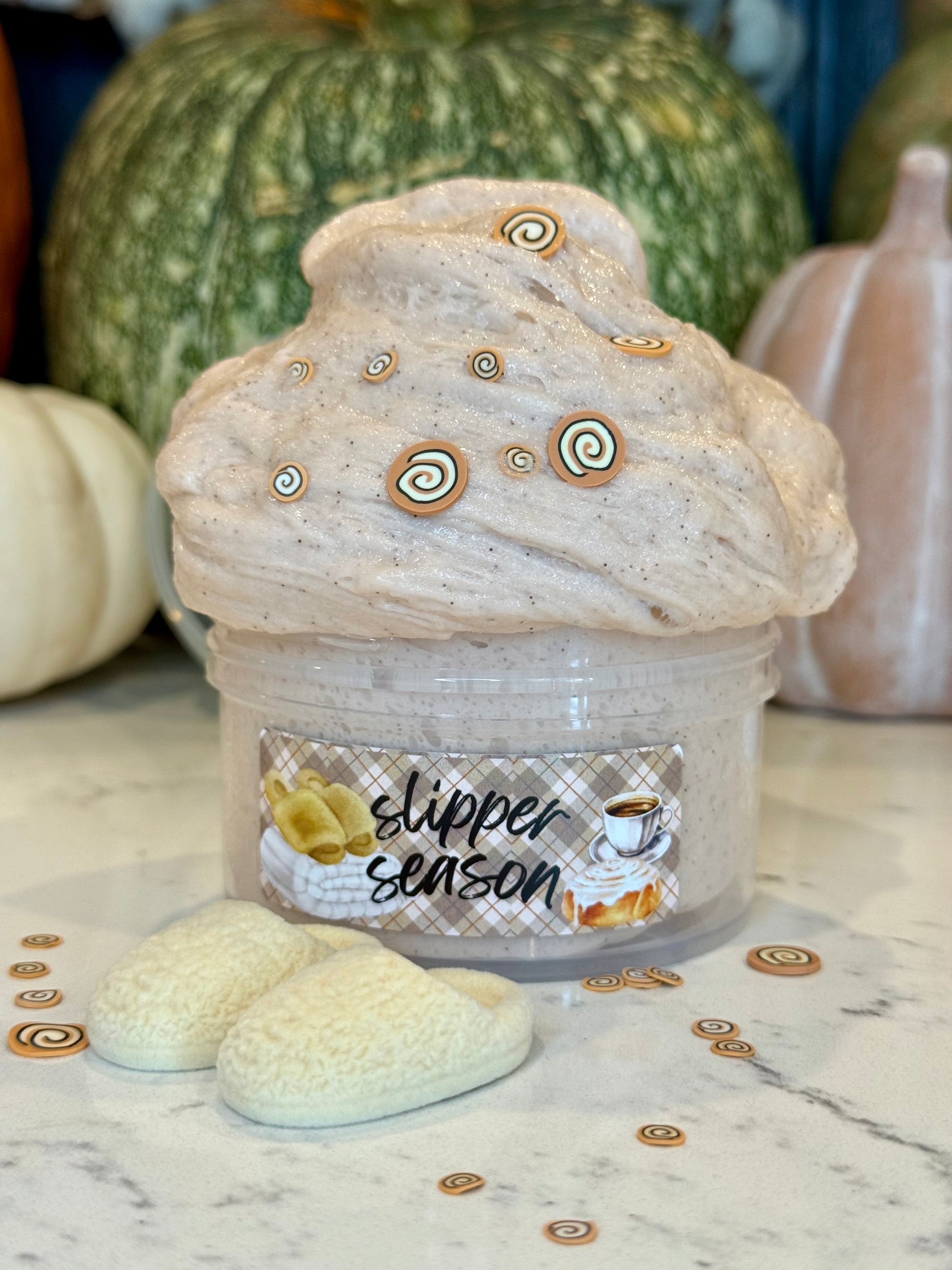 Slipper Season is a soft, squishy white glue jelly topped with a 2oz clear glitter topper that you can swirl together to make a fluffy, bouncy texture. It does have a slight pull to begin with, but once you get it inflated, itโs perfect. Itโs scented like a sweet, warm iced cinnamon roll. Donโt eat it! But it does smell delicious.ย Comes with a pair of mini flocked slippers (multiple colors) and cinnamon roll fimos. This one is just ๐ค๐ป!