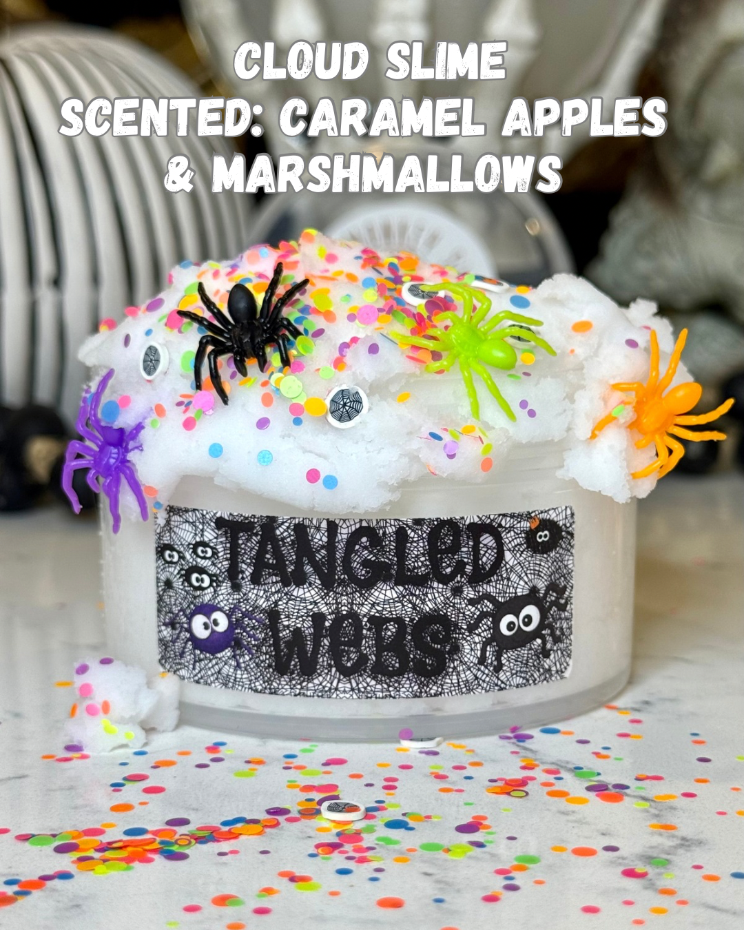 Scented like caramel apples and marshmallows, it smells just like a cozy Halloween night at the carnival. 🍎🍬 Each slime comes topped with colorful spiders and confetti, making it as cute as it is creepy.🕷️💜